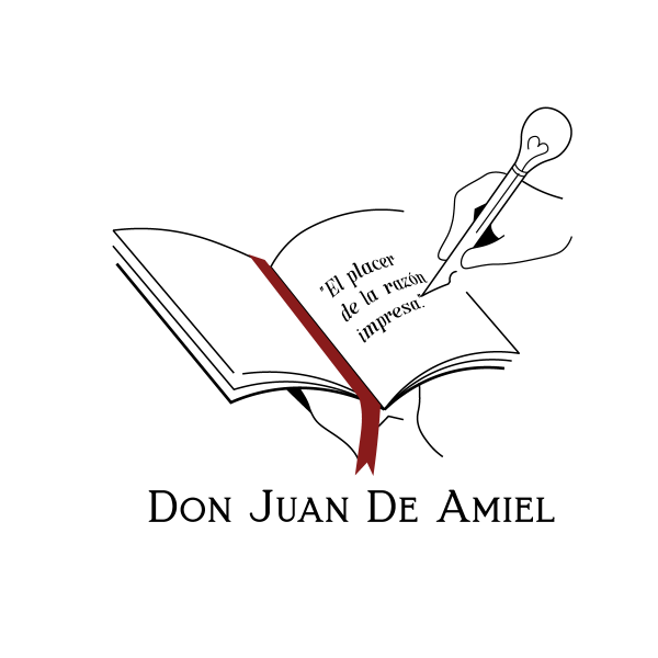 Entonces, teniendo en claro que un libro es como un hijo, me puse a pensar que hay que construir un buen hogar para hacer crecer a los libros con conciencia social, y fue así como comencé a gestar la idea de una editorial con conciencia social, a la que no sabía cómo llamar, hasta que recordé dos artículos de Gregorio Marañón sobre dos personajes, uno una leyenda y el otro uno real, quienes representaban a la falsa y super virilidad, ambos recopilados por Antonio en un libro que me diría tu editorial debe llamarse “Don Juan De Amiel”, porque sería como equilibrar al ser humano en sí mismo, sin ir ni a un extremo que es lo falso ni al otro que es la superioridad, buscando de esa manera un equilibrio entre la fe y razón, entre el corazón y el placer, cosa que me llevó a pensar que el eslogan perfecto para la editorial sería: “El Placer De La Razón Impresa”, porque es indispensable equilibrar el instinto con la razón, el ser animal con lo racional, la pasión con el amor, puesto que cuando el ser humano empieza a ser dueño de sí mismo puede tener conciencia de sí como también de la sociedad en general; y, por lo tanto, sabe lo importante que son sus acciones para el bien común, orientando cada una de sus acciones a favor de la dignidad humana, sin egoísmo ni miseria, es decir, de una manera trascendental, yendo más allá de sí mismo, en busca de un bien superior que no choque con el personal, por ende, a ese bien lo podríamos llamar bien común, porque nos permite proyectar nuestras ideas razonables sin desprenderlas de la nobleza del corazón, y creo que por eso Marañón decía que “la lección fundamental en la vida es la prevalencia de la bondad sobre la inteligencia”, algo que se intenta practicar en la editorial como parte de su razón de ser; y, por eso hoy podemos observar que en el logo se encuentra un libro sostenido por la mano izquierda que representa al corazón, a la igual de mí con los otros, mientras que la mano derecha es la que escribe, porque es ella la que representa a la razón, a ese ir recto, a ese vivir con dignidad, con conciencia, con igualdad al otro, sin superioridad ni irracionalidad. Y sí seguimos observando el logo encontraremos más detalles como esa pluma que no solo es una pluma en sí misma, sino también un bisturí que es capaz de abrirte el alma, desangrarte, así como también un foco que representa la luz de las ideas, así como un corazón dentro del foco, porque una escritura sin pasión es un texto vacío de ser, porque cuando uno escribe lo que hace es dejar en el texto la vida, y por eso la pluma nos desangra, la tinta es nuestra sangre, nuestra vida, nuestra existencia humana, y por eso mismo vamos a contemplar que el eslogan está dentro del libro dividido en tres líneas: una representa al pasado, otra al presente y la otra al futuro. Asimismo, observamos que el libro está compuesto por tres páginas, en las que se escribe: un lado representa a la familia o a la vida misma, y por eso va ahí el lazo de sangre que los unes, pero al mismo tiempo esas mismas páginas nos hablan del ser, ese ser que tiene ese alma vegetal, animal y humana; y, por ende, las otras tres páginas representan al ser y su accionar en uno mismo, en los nuestros y en la sociedad, porque no somos seres aislados si no seres sociales desde nuestra naturaleza, motivo por el cual no podemos dejar de tener conciencia social, no podemos hacernos los ciego ni los tontos ante la realidad sociocultural en la que vivimos… Y es así cómo se gesta toda la idea de la editorial Don Juan De Amiel, así que esperamos seguir con estas firmes ideas en el tiempo, mejorando y creciendo sin dejar de ser ni hacer.